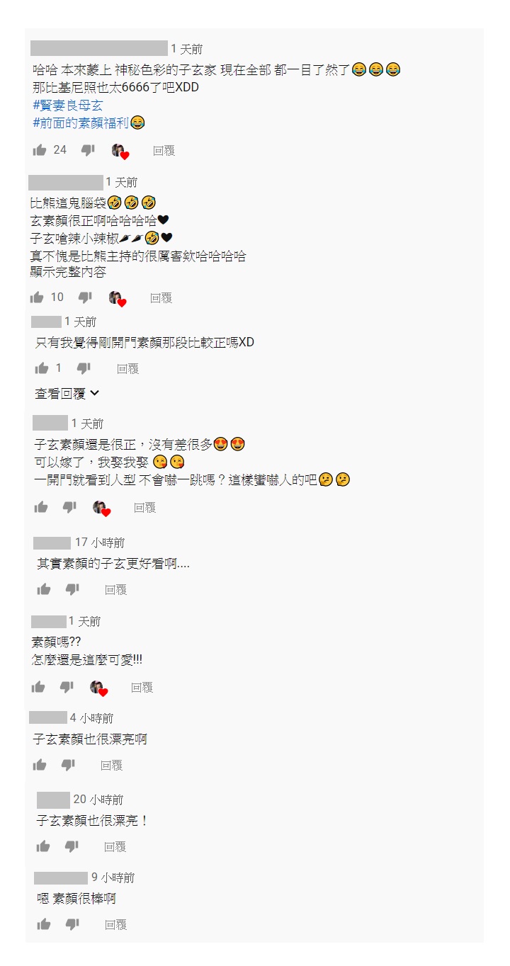 最後,終於在一陣嬉鬧後,「子玄」帶領著「比熊」開箱了自己的新家和房間,而網友們在瞧見「子玄」的素顏後,紛紛留言表示「子玄」素顏根本就沒差,更直言「玄素顏很正啊」「只有我覺得剛開門素顏那段比較正嗎」「子玄素顏還是很正,沒有差很多」「素顏嗎??怎麼還是這麼可愛!」。