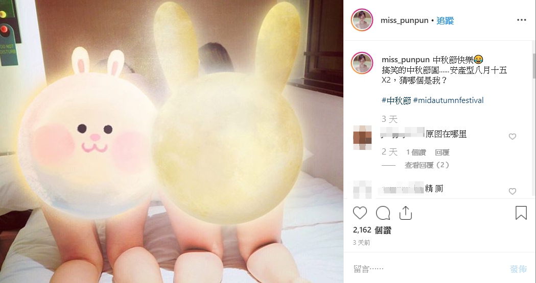 搣時潘在13日PO出一張引人遐想的「背後式」照片,照片中她和另一名女子疑似一絲不掛,跪趴在床上,從「背後式」角度入境,並應景中秋節,P上月亮和兔子的圖案遮掩重要部位,搞笑向網友表示:「中秋節快樂,搞笑的中秋節圖......安產型八月十五X2,猜哪個是我?」,讓網友紛紛暴動大喊:「原圖在哪裡?」