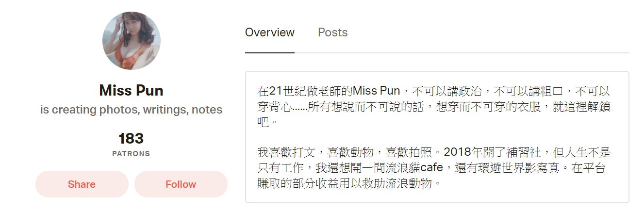 香港有一名網紅教師「搣時潘(Miss Pun)」,因為擁有清純的外貌和姣好的身材,曾多次上過PTT表特版。搣時潘身為教師的身分,和她大尺度的風格形成強大的反差,吸引不少粉絲,在IG上有超過7萬名粉絲追蹤,近日她在IG上PO出和中秋應景的火辣照片,讓網友紛紛暴動。