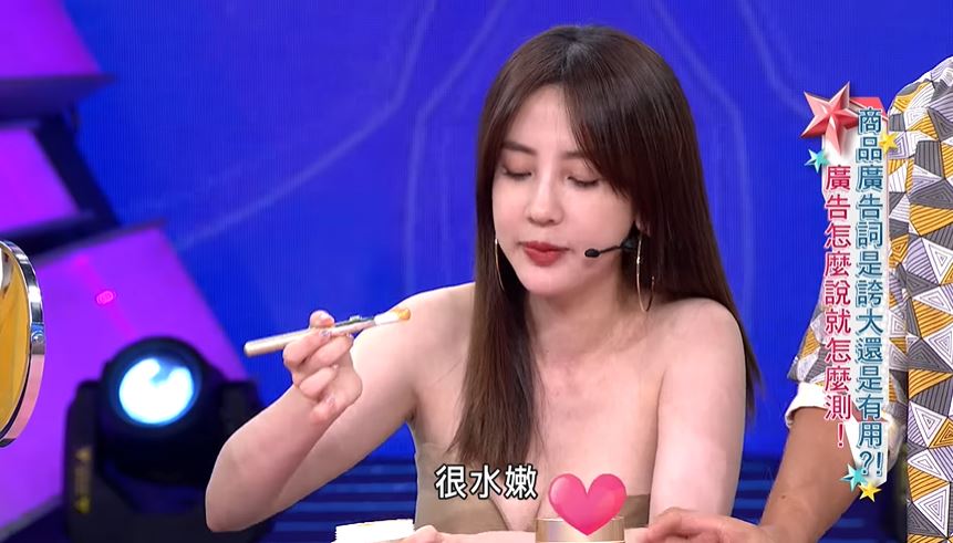 影片中看到,張艾亞當天穿著一件平口低胸的咖啡色長洋裝,小深V的低胸設計,讓他雪白的酥胸呼之欲出。不過當他坐下來介紹面膜時,張艾亞將凍膜塗在自己的手上,鏡頭特寫她的手,後製卻在張艾亞的胸口打上小愛心,且疑似洋裝有點太大件,上半身越掉越低,後製還必須一次打上兩個小愛心才有辦法遮住走光的部分。