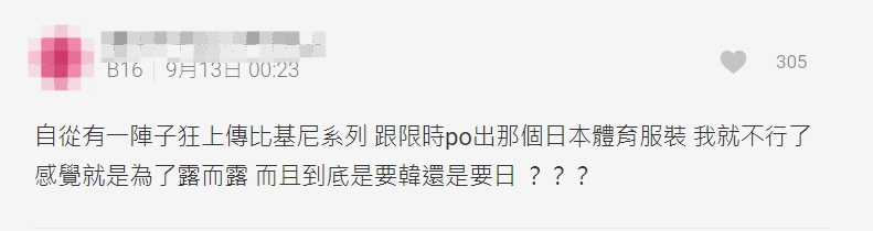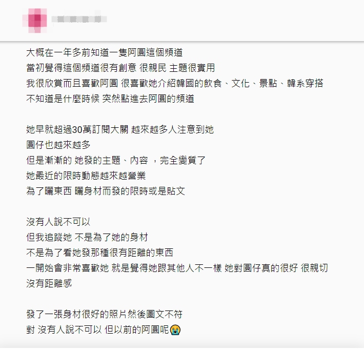 近期有網友在Dcard上表示,自己是粉絲卻發現阿圓逐漸變質,限時動態越來越營業化,常常為了曬身材而發限時或是貼文,和過去可愛親切的形象有所差別。貼文一出,引起不少網友附和,並加碼表示阿圓其實沒有很韓、和男友互動逐漸變少:「自從有一陣子狂上傳比基尼系列,跟限時po出那個日本體育服裝,我就不行了,感覺就是為了露而露 」、「只我覺得其實她沒有很韓嗎……欸欸不是去語學堂念過就可以變韓系R」、「我也發現他最近的限時動態真的⋯幾乎每則都是自拍就算了,明明有男友,還要大家評論他跟阿傑配不配,我整個問號」。