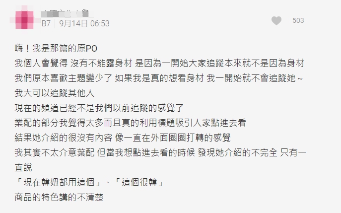 在該網友發文之後,原po也在底下留言,認為「沒有不能露身材,是因為一開始大家追蹤本來就不是因為身材,我們原本喜歡主題變少了 如果我是真的想看身材 我一開始就不會追蹤她~我大可以追蹤其他人,現在的頻道已經不是我們以前追蹤的感覺了」,引發正反兩面評論,論戰越演越烈。日前,阿圓在限時動態表示「阿圓是不會被打倒的」,疑似是針對此事做出回應。