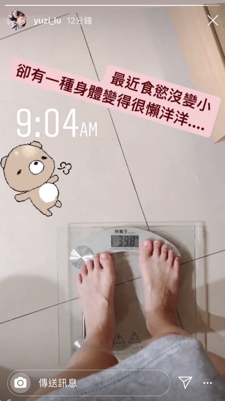 路路身材嬌小,四肢相當纖細,卻擁有非常驚人的食量,近日她在限時動態中表示「最近食慾沒變小,卻有一種身體變得很懶洋洋」,並慢慢地踏上體重機測量體重,結果體重居然只有39.8公斤,甚至不到40公斤!過輕的體重嚇翻不少網友。