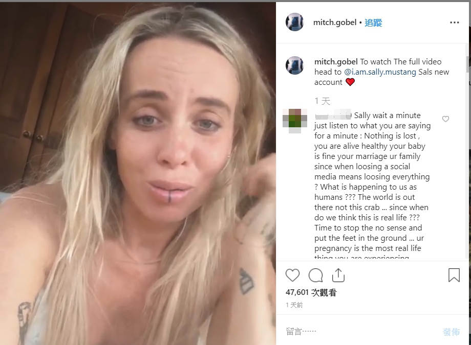 莎莉(Sally Mustang暫譯)和米奇(Mitch Gobel暫譯)是一對來自澳洲拜倫灣的藝術家情侶,他們時常在社群網站上分享兩人親暱露骨的照片,因而小有名氣,吸引不少粉絲。近日莎莉因為被判定為色情違規,IG帳號直接被刪除,讓她忍不住淚崩。