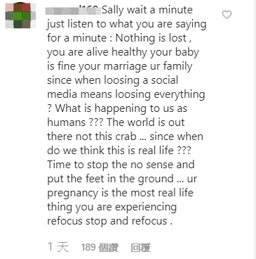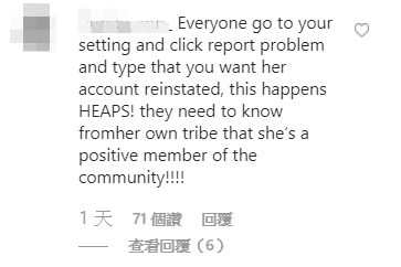 雖然莎莉辦了第2個帳號,但現在似乎也遭到刪除。影片一出,大批粉絲紛紛安慰她,已經試圖向IG申訴,並祝福莎莉的帳號早日回來。但也有粉絲認為,莎莉過於看重社群軟體,向她喊話:「妳什麼都沒有丟失,你還活著健康,你的寶寶、你的婚姻和你的家庭一切都很好,妳怎麼會因為失去社交媒體就覺得失去了一切?」引起不少粉絲共鳴。