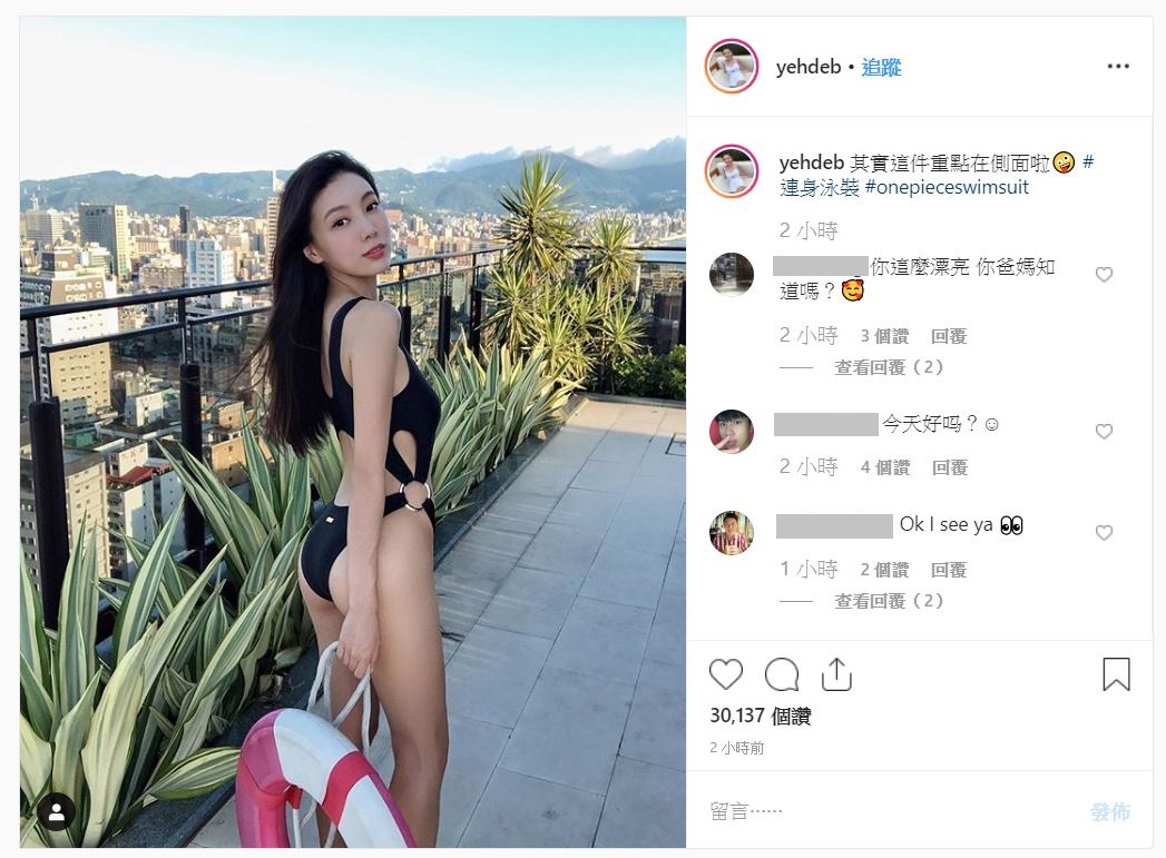 近日,在諸多網友的引頸期盼下,「邵岱兒」於昨日又PO出了一張她身穿「黑色連身泳衣」的照片,照片中的她穿著一件一體成型的黑色泳衣,上半身是一個大U型背心,而側邊則以兩個圓環連接下半身的泳褲,胸口以下則是呈現完全簍空的樣式,完全展現出了「邵岱兒」的渾圓胸型和平坦腰腹的完美身形,更讓網友看了直呼「Debbie想看背面照」「好辣喔」「你的身體好美,有點誇張」。