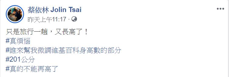 華語流行樂壇天后蔡依林(Jolin)出道至今約20年,在這個月15日時,她迎來自己39歲生日,特地和親朋好友飛往泰國慶生。而蔡依林玩樂之餘不忘在社群軟體上分享自己的美照,更透露自己旅行一趟又長高了,公布最新的「真實身高」,要求網友幫她更改維基百科的資料,幽默的互動逗樂一群粉絲。