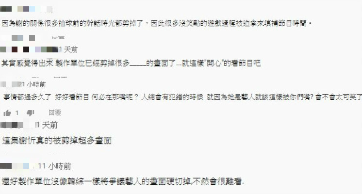 網友們紛紛表示:「因為謝的關係很多抽球前的幹話時光都剪掉了,因此很多沒笑點的遊戲過程被迫拿來填補節目時間」、「其實感覺得出來,製作單位已經剪掉很多畫面了」、「現在能感受到被針對的藝人的鏡頭量了XDDD…除了堆大頭,對話幾乎都被刪掉了…」、「這集謝忻真的被剪掉超多畫面」。不過其實,這集謝忻的畫面似乎原本就沒有很多,因為玩遊戲剛好都抽到比較後面的號碼,依照《3國智》的遊戲規則,按照順序玩,前面有人先過關就結束關卡,導致謝忻的鏡頭本來就不多。