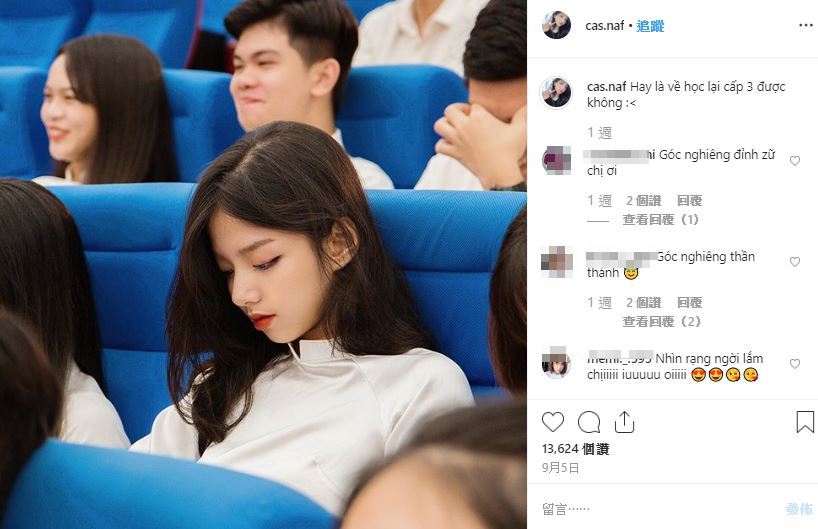 根據越南媒體《kenh14.vn》報導,先前網路上流傳著一張女大生在開學典禮上,仙氣外漏的側臉照,該名女大生的IG也隨即被肉搜,他就是現年僅18歲的Phan Thi Minh Hang,目前就讀當地國立經濟大學。從IG可見,Phan Thi Minh Hang不僅擁有漂亮的臉部線條,更有一雙渾圓大眼和尖挺的鼻子,洋娃娃外貌絲毫沒讓網友失望,意外爆紅的他也將該張照片轉貼到個人IG,並發文說到「好想回到高中」。