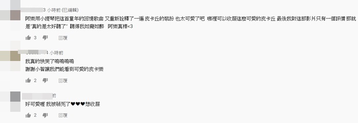 阿樂魅力大爆發,影片一出立即引來不少網友留言表示,「完全沉浸在美妙的小提琴琴聲裡,人美又這麼有才華都想娶妳回家了」、「皮卡丘的裝扮也太可愛了吧! 哪裡可以收服這麼可愛的皮卡丘」、「好可愛喔 我被萌死了❤❤❤想收服」、「看完覺得,用愛發電是可行的」。
