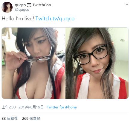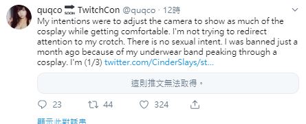 上個月,Quqco就因為角色扮演《拳皇》中的火辣角色「不知火舞」,疑似露出內衣而遭到停權處分,因此Quqco也記取教訓小心使用平台,此次平台又再度消失,Quqco更收到不少性騷擾的言論他解釋「外界的欺凌和媒體關注,把我塑造成妓女、蕩婦」他表示自己僅能默默接受一切。