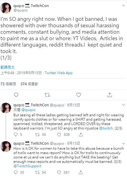 Quqco以自身經歷點出TWITCH模糊的審核標準恐替女性帶來負面影響,他解釋「很多女生穿舒適短褲跟襯衫,就收到大批騷擾訊息還被大篇幅報導」,對此有不少網友出面表態「很多女性都遭遇相同挫折」、「我很同意禁止穿著緊身背心,之前看到男網紅上空健身,就有很多女網友獻殷勤」、「的確不管男女生都面臨審核標準不一的狀況,但你就是把鏡頭往下扳了」。
