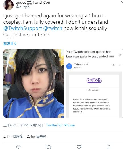 遊戲直播平台TWITCH近期遭到不少直播主抗議平台無辜被停權,官方審核標準問題再度浮上檯面,近期就有一名女直播主Quqco因為角色扮演《快打旋風》的「春麗」,平台卻慘遭禁播三天,讓他憤而一連發文強調服裝已經「完全覆蓋」,同時Quqco也因此收到不少騷擾訊息痛批外界將他比擬成「行為不檢點的妓女」。