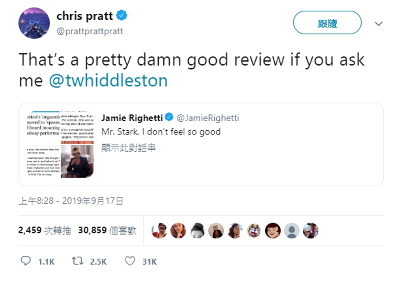 這則令人一言難盡的新聞也被「星爵」克里斯普瑞特(Chris Pratt)看到,他立刻在推特上轉發並調侃漫威同事湯姆希德斯頓:「要我說,這可是相當棒的絕佳好評了。」畢竟湯姆希德斯頓本人站在舞台上就能帥到令女粉絲現場高潮,完全證明了「洛基」超凡的魅力。