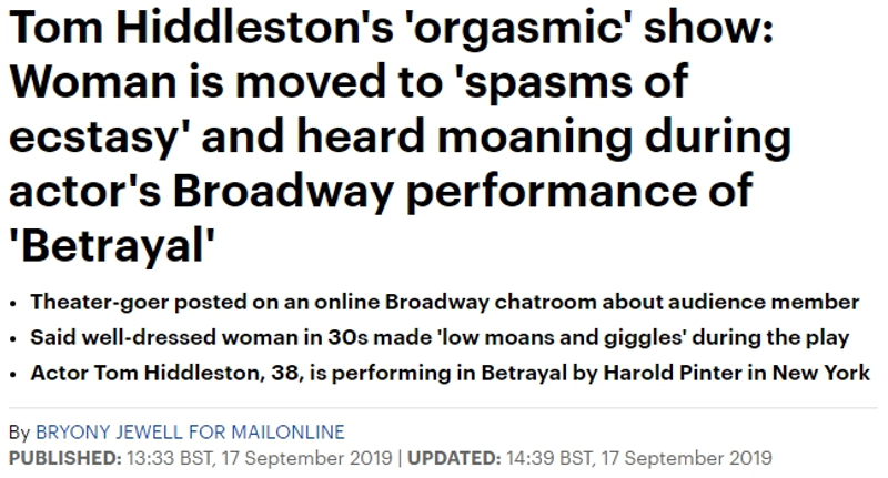 ▼不過沒想到現在國外媒體紛紛報導了湯姆希德斯頓在《背叛》近期於百老匯的表演現場,居然有一位年紀約莫為 30 多歲的女性在觀看湯姆希德斯頓演出的過程一講到刺激性話語或是和女演員有接吻戲碼時,他突然就在座位上公開「自我安慰」了起來,同時發出了很大的呻吟聲,最後甚至達到痙攣式的高潮兩次,與這位奇女子同一排的現場觀眾都能夠證實此事。