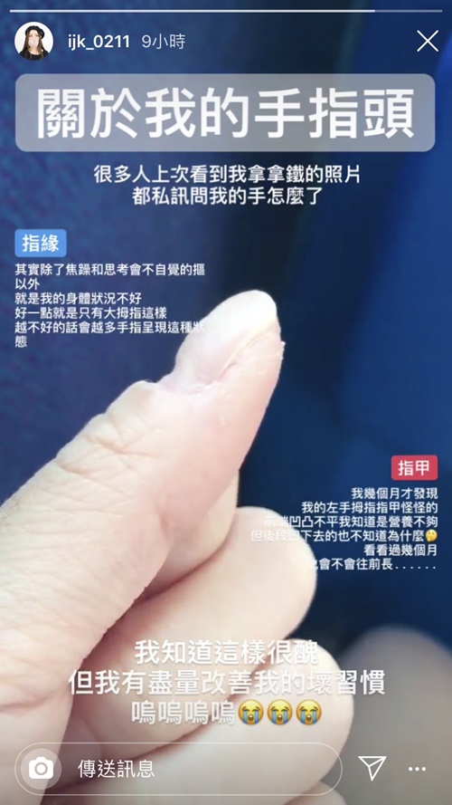 關關日前在限時動態中貼出大拇指照片,只見指甲後段整個凹陷,也因此過去常被網友私訊關心,讓她決定一次解釋清楚!她先提到指緣的部分,當她正在思考或者感到焦躁時,會不自覺想摳手指。除此之外,因為身體狀況不好的關係,常導致手指呈現這種狀態。