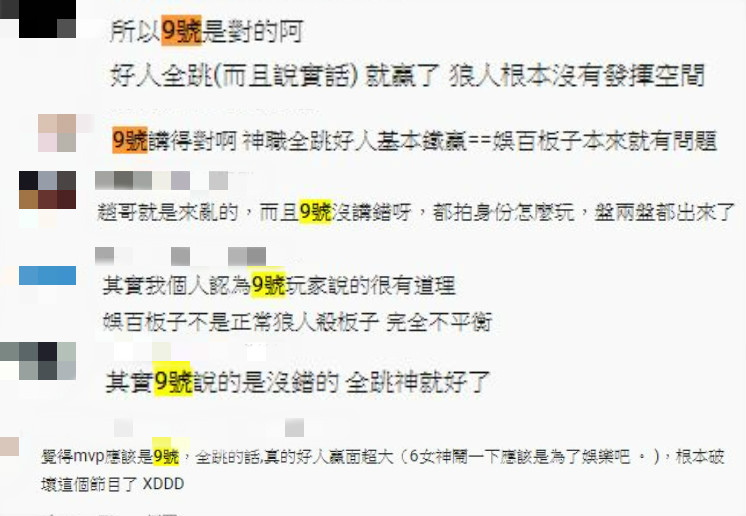 不少網友們也同意素人玩家的說法:「好人全跳就贏了,狼人根本沒有發揮空間」、「講得對啊!神職全跳好人基本鐵贏,娛百板子本來就有問題」、「其實我個人認為9號玩家說的很有道理,娛百板子不是正常狼人殺板子,完全不平衡」。不過也有網友認為沒有絕對,但贏的機率確實比較大。