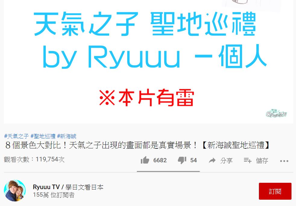 18日時,「Ryuuu TV / 學日文看日本」上傳影片「8個景色大對比!天氣之子出現的畫面都是真實場景!」巡禮日本動漫電影「天氣之子」的實際場景,獲得不少好評。隨後Yuma透露這部影片背後的小故事,表示自己看了影片之後,才發現Ryu的暖心舉動。
