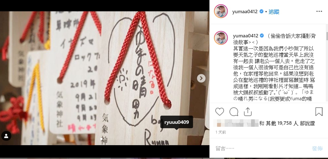 Yuma表示,因為兩人有所紛爭,所以拍攝影片的當天早上,她沒有和Ryu一同前往,雖然自己很快就後悔了,但還是留在住處等Ryu回來。直到看見影片後,Yuma才發現,雖然Ryu和自己吵架,但是老公在神社裡寫願望時,仍在繪馬上寫:「ゆまの晴れ男になる(我要變成Yuma的晴男)」,讓她相當感動,表示「嗚嗚,被大頭叔叔感動了」,並大讚Ryu的字相當療癒。