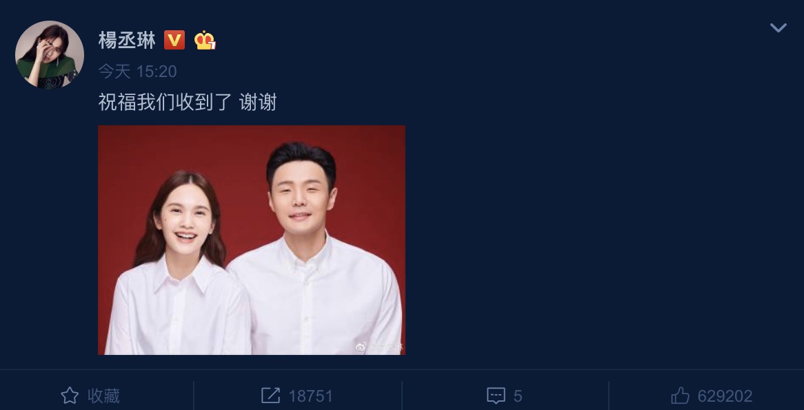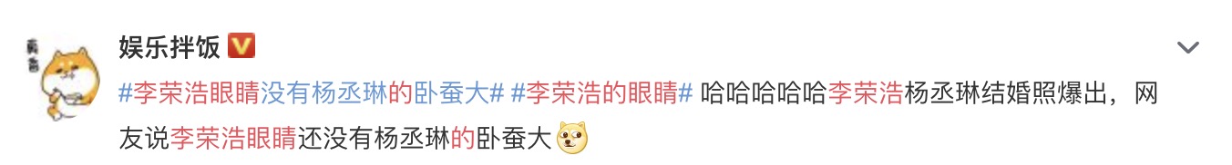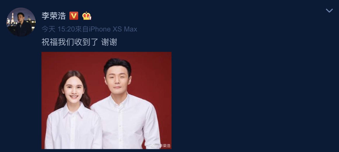 今日(19)楊丞琳出席代言活動時鬆口確認兩人已領證,說道:「對啊,前天領證了。」,證實了17號時流出的照片是兩人,而當楊丞琳受訪完畢後,小倆口也各別在IG以及微博上發出結婚證件照,並發文寫下:「祝福我們收到了 謝謝」,消息一出更瞬間衝上微博熱搜榜第一名,成為全民熱議的話題。然而在公開的證件照中,李榮浩的眼睛又再度成為網友的焦點,許多人認為李榮浩的眼睛和楊丞琳的眼睛對比起來差異非常大,紛紛搞笑的留言:「怎麼閉著眼照相」、「這麼大喜的日子 咱眼睛能睜開嗎哥求你了」、「老李頭你給我把眼睛睜開」