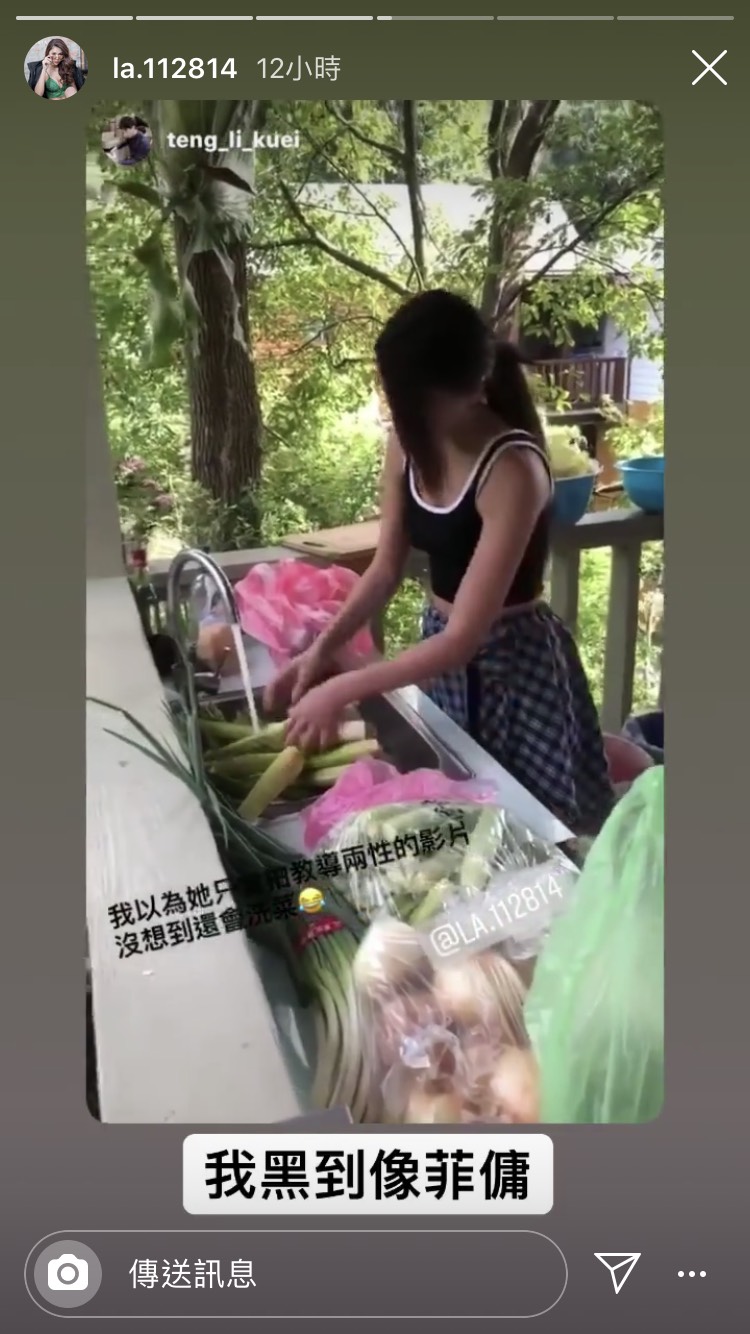 不過在蕾菈的限時動態中,她轉發朋友偷拍自己的影片,意外透露自己0修圖的「真實面貌」,但疑似燈光問題,讓蕾菈看起來相當黝黑,不同於平常白皙的肌膚,因此蕾菈自己也忍不住吐槽:「我黑到像菲傭」。在影片中,蕾菈相當專注於洗菜,渾身散發「媽媽味」,連朋友都開玩笑表示:「我以為她只會拍教導兩性的影片,沒想到還會洗菜」。