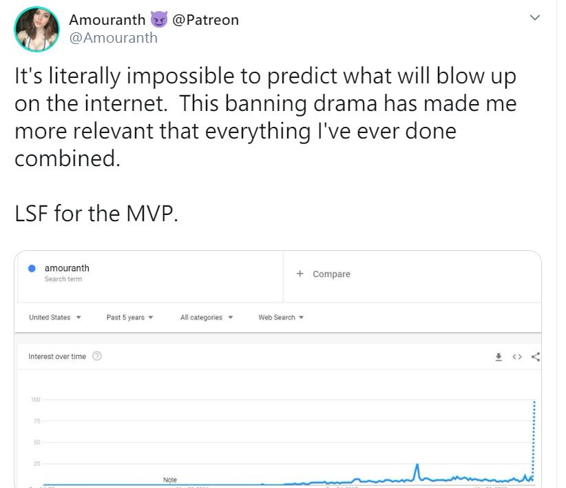 事實上,Amouranth坦承這次的停權事件讓她的粉絲大幅增加。原先Amouranth在Twitch上相關頻道中的熱門度排名第三,僅次於「Pokimane」和「Michaela」,經過此次事件後,Amouranth的頻道已經超過「Michaela」,升至第二位。Amouranth也表示:「幾乎無法預測網路上什麼會突然爆紅。這部被Ban的影片帶來的超高流量會讓我更加重視我所做過的一切」。