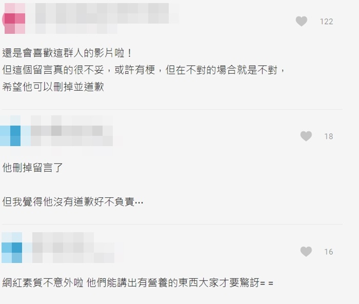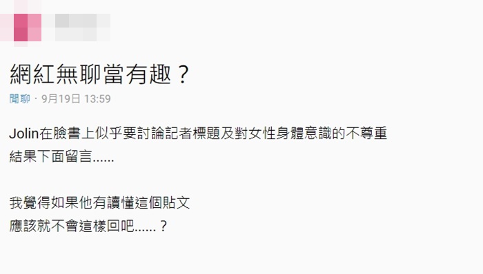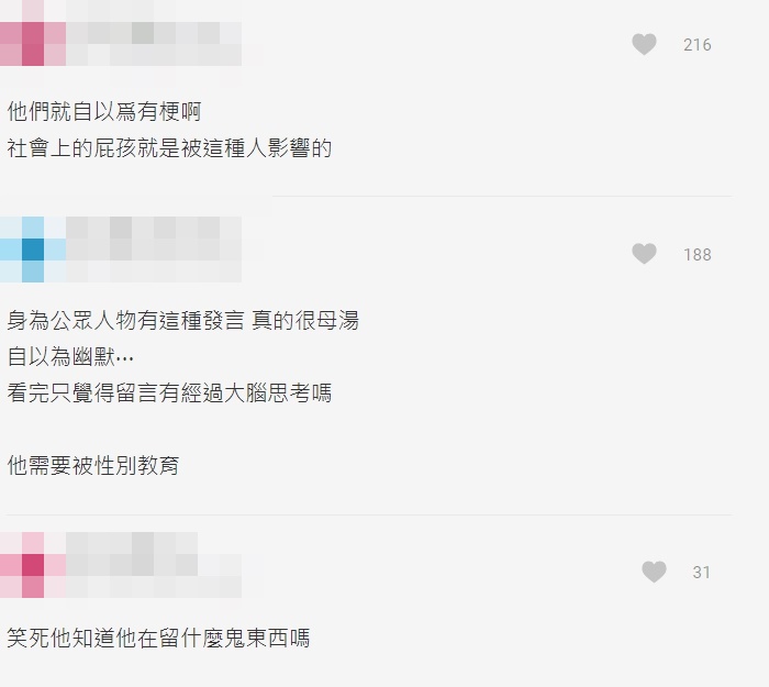 Dcard文章一出,立刻有不少人留言表示,「就自以爲有梗啊!社會上的屁孩就是被這種人影響的」、「身為公眾人物有這種發言真的很母湯,看完只覺得留言有經過大腦思考嗎?他需要被性別教育」、「笑死他知道他在留什麼鬼東西嗎」、「希望他可以刪掉並道歉」、「在一篇喚起大家身體意識的文章下面留這種超不尊重身體意識的言論,只能說性別教育真的失敗」。