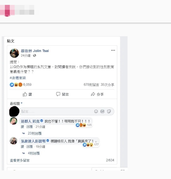 日前天后「蔡依林」在FB上發文提問,「以G奶作為標題的系列文章,對閱讀者來說,你們接收到的性別教育意義是什麼??」雖然只有短短幾句,仍看出問題十分嚴肅。然而尼克看完後,竟在下方回覆,「我也不懂!!明明就不只!」,留言一出瞬間遭到網友撻伐!