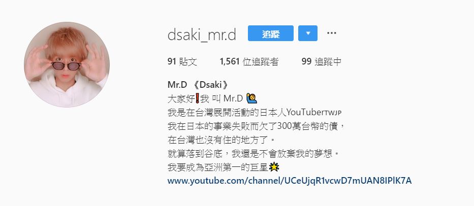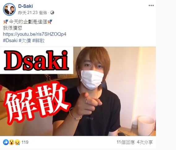有網友在大學生論壇「Dcard」發文,整理出Dsaki近期發生的爭議,直呼:「看到變成這樣真心覺得太歪了」。內文提及,近期Mr.D在Youtube發佈一部影片,表示自己因為在日本的公司資金周轉不靈,所以現在沒有地方住,但是因為很喜歡台灣,所以還是想留在台灣努力。隨即Mr.D也在IG上,PO出自己拿著標語「欠債300萬,沒有家,請給我錢」的照片,並將個人簡介改成「我在日本的事業失敗而欠了300萬台幣的債,在台灣也沒有住的地方了」。