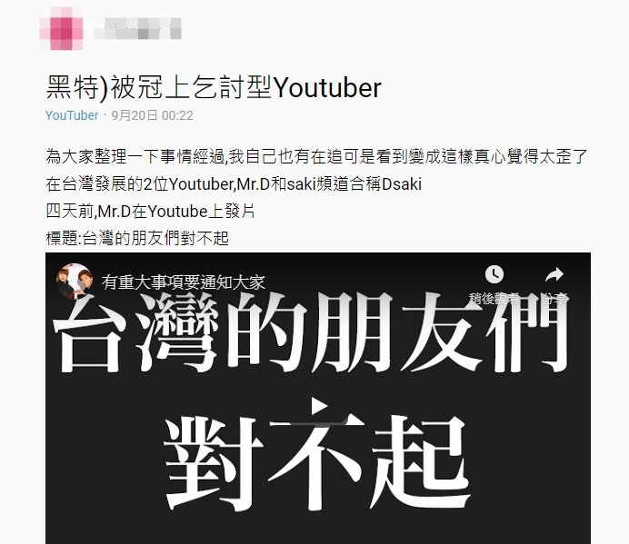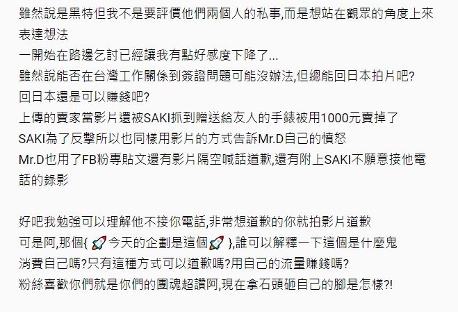 事件越演越烈,讓Dcard原PO也提到,自己勉強可以接受Mr.D因為對方不接電話,所以拍影片道歉。但是在標題打上「今天的企劃是這個」,讓原PO認為兩人是利用炒作增加名氣,怒轟:「消費自己嗎?只有這種方式可以道歉嗎?用自己的流量賺錢嗎?」,引起網友討論。