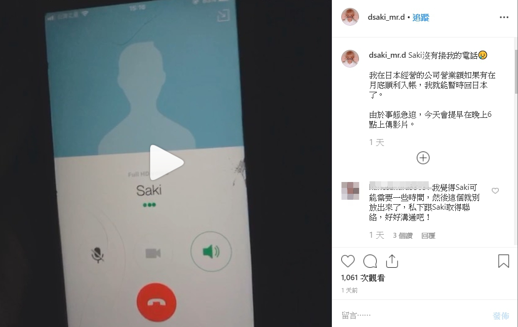 隨後,Mr.D再度在Youtube上傳影片,表示自己因為缺錢,所以將家產幾乎都典當了。而搭檔Saki透過該影片,發現自己送給Mr.D的手錶也被以低價售出,讓Saki透過兩人共同經營的頻道Dsaki抗議,並表示短時間內不會參與影片的錄製。而Mr.D則也拍攝影片道歉,並在IG上傳自己打給Saki,但是對方未接電話的影片,並表示:「Saki沒有接我的電話,我在日本經營的公司營業額如果有在月底順利入帳,我就能暫時回日本了。由於事態急迫,今天會提早在晚上6點上傳影片」。
