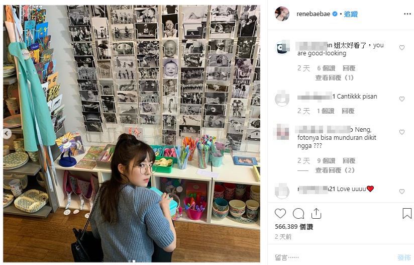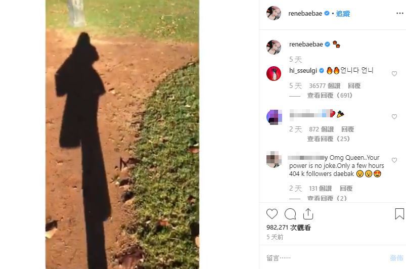 Irene於上周開設個人IG帳號至今也有超過91萬人追蹤,第一篇貼文就是他開心蹦跳的影子,就連好姊妹瑟琪也馬上在底下留言應援到「姐姐啊~」。近日,Red Velvet前往瑞士出席活動,期間Irene也公開不少度假照,像是蹲在一排名信片牆前面突然回眸的表情,或是在綠地盪鞦韆的畫面,都讓粉絲一睹Irene最真實的一面紛紛表示「真的是寶貝了」。
