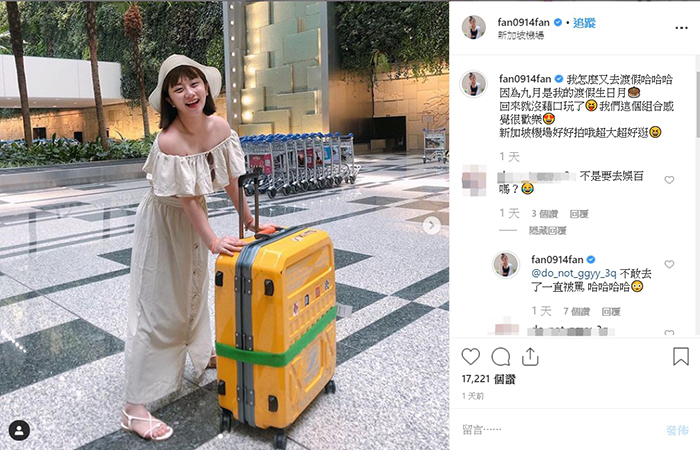 22日時,焦凡凡發文表示:「我怎麼又去渡假哈哈哈因為九月是我的渡假生日月,回來就沒藉口玩了,我們這個組合感覺很歡樂,新加坡機場好好拍哦超大超好逛!」,透露自己和網紅「陳彥婷Tiffany」、彥婷男友「巨人Giant」以及Youtuber「關韶文關關」一同到新加玻遊玩。