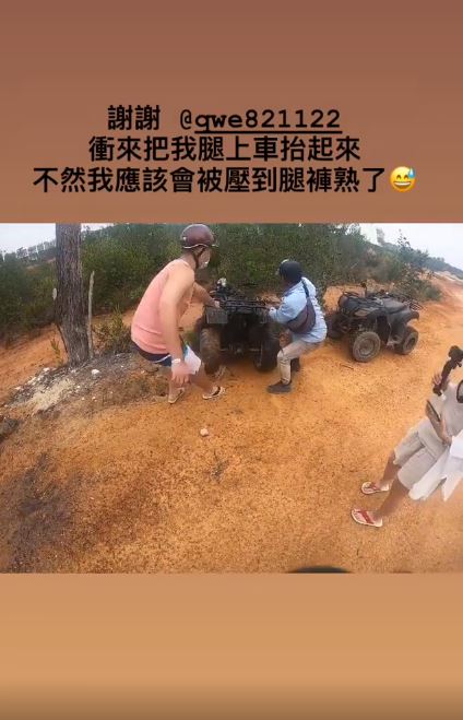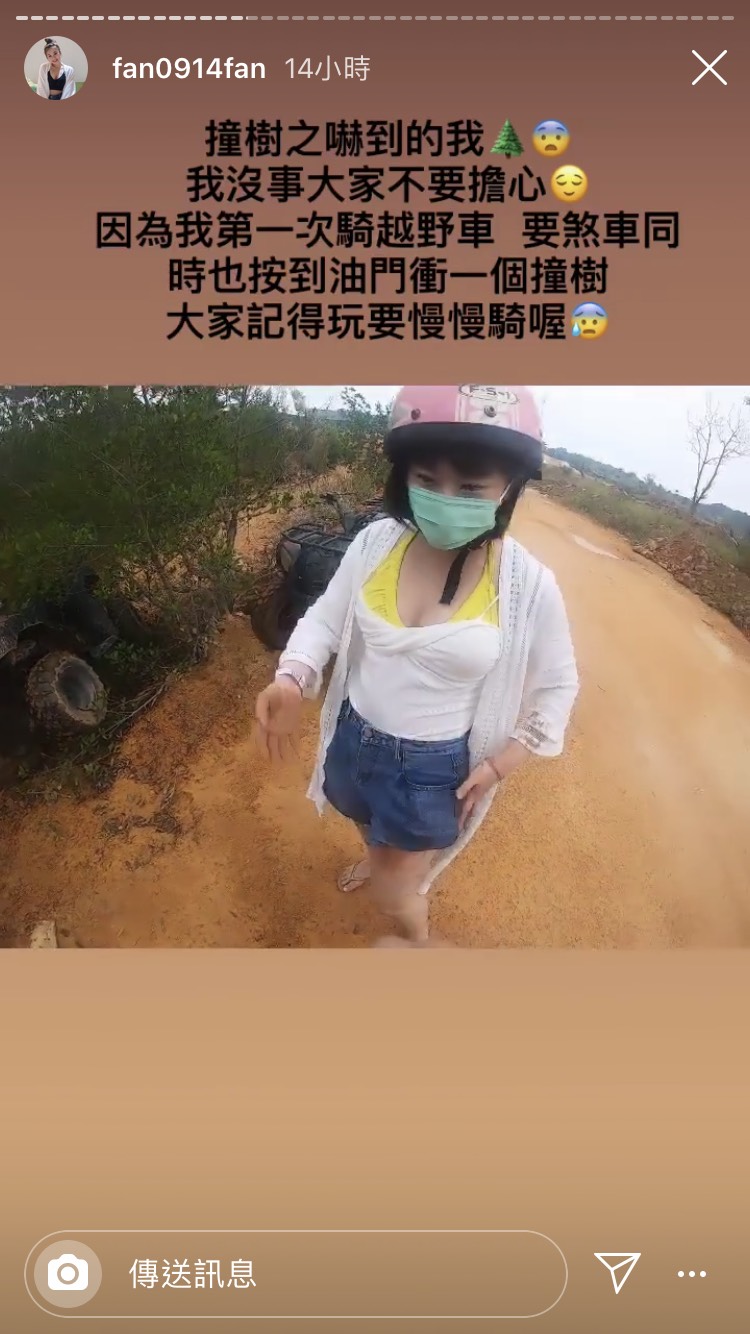 焦凡凡在23日時,開心PO出限時動態,影片中她頭戴一頂草帽,身穿一件黃色比基尼,外加一件罩衫,看起來既清純又性感。當時焦凡凡表示自己要去玩越野車,豈料過不久,焦凡凡就再度分享限時動態,表示自己不小心同時踩了油門跟剎車,結果直接撞到樹叢上,整台越野車直接壓到她的身上。焦凡凡委屈表示:「我的腿庫受傷了」,並露出大腿上的大片瘀青,看起來相當怵目驚心,令不少粉絲非常緊張。