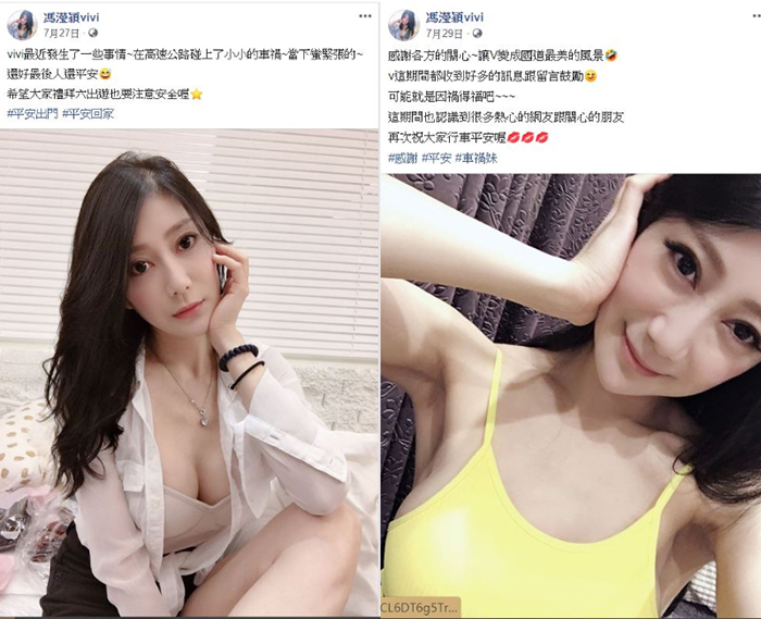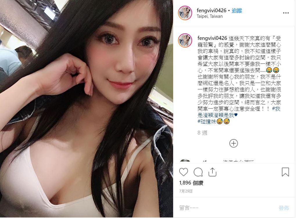 而之後更有網友直接神出這名女子就是網紅女模「馮瀅穎vivi」,女模「Vivi」擁有33D的姣好身材,更時常在IG和粉專上分享自己性感火辣的照片,也吸引了不少的粉絲追蹤,而近日她則在節目《綜藝大熱門》中提及了車禍當天的狀況和後續影響。