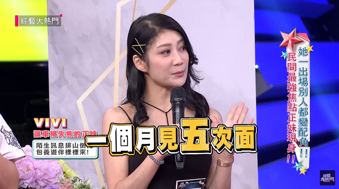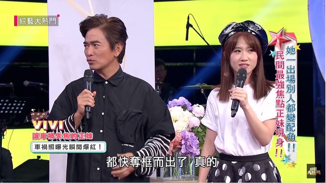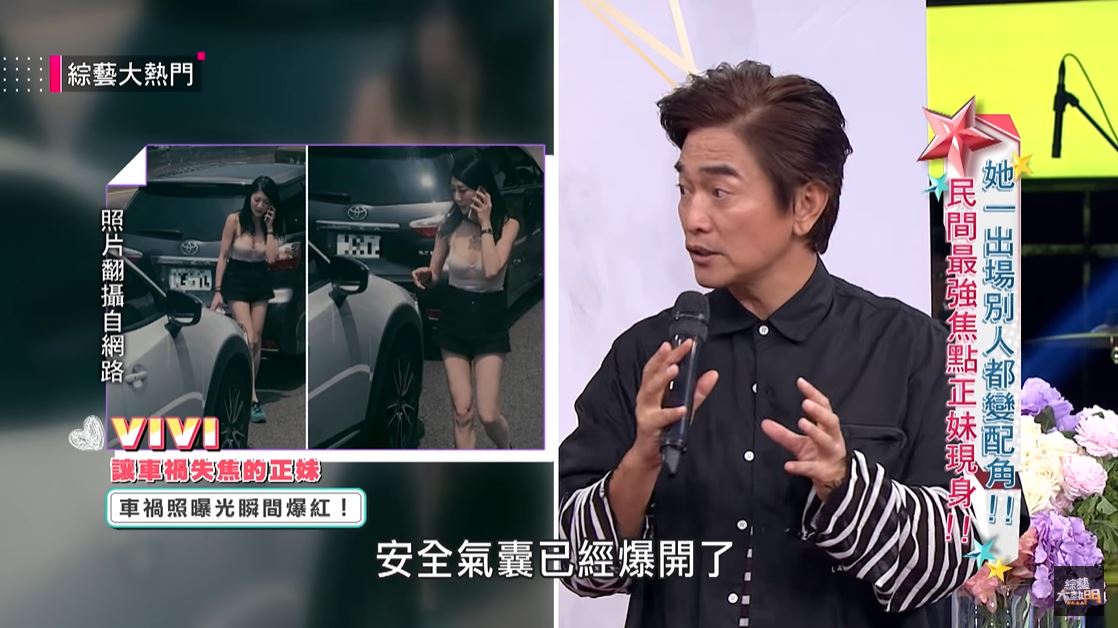 「Vivi」表示當日是自己撞到了別人,因而下車查看狀況,而一旁的主持人吳宗憲在看到車禍現場「Vivi」的火辣穿著後,則笑稱「這張照片是安全氣囊已經爆開了,才產生這個效果」,直呼「Vivi」身材和打扮實在太過性感火辣,更直言「都快奪框而出了」 ,而對此「Vivi」也解釋是因為天氣太熱,才穿得這麼清涼。