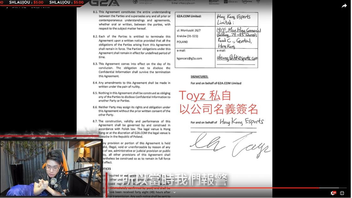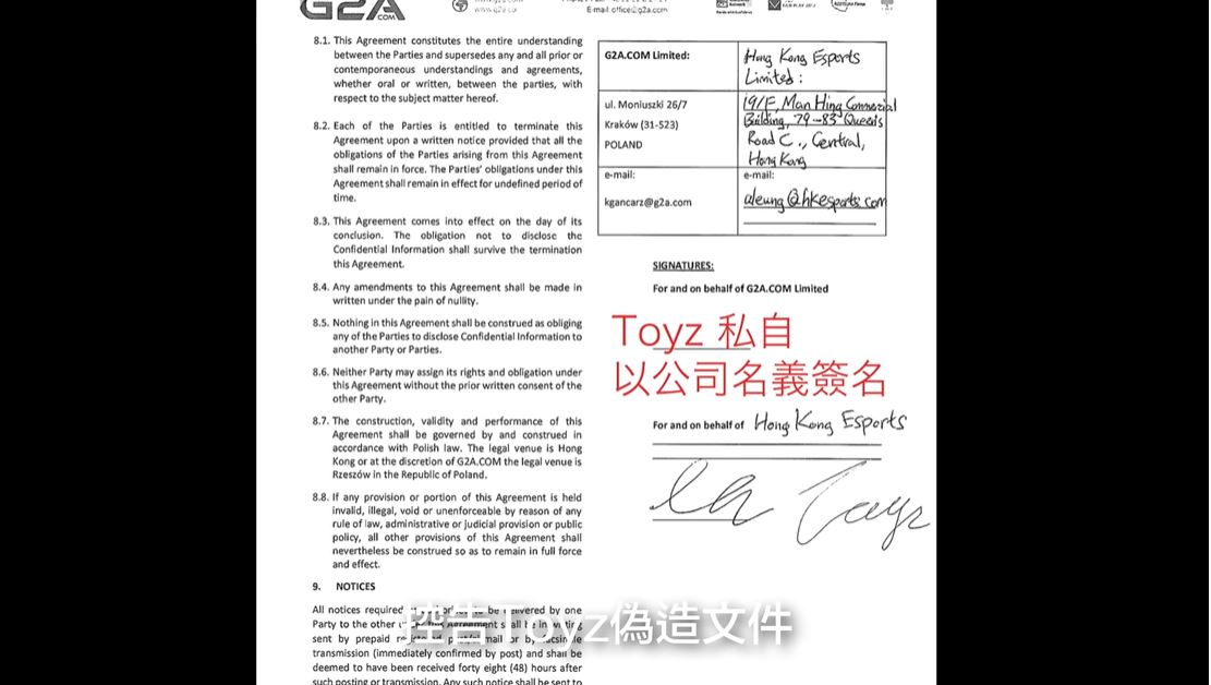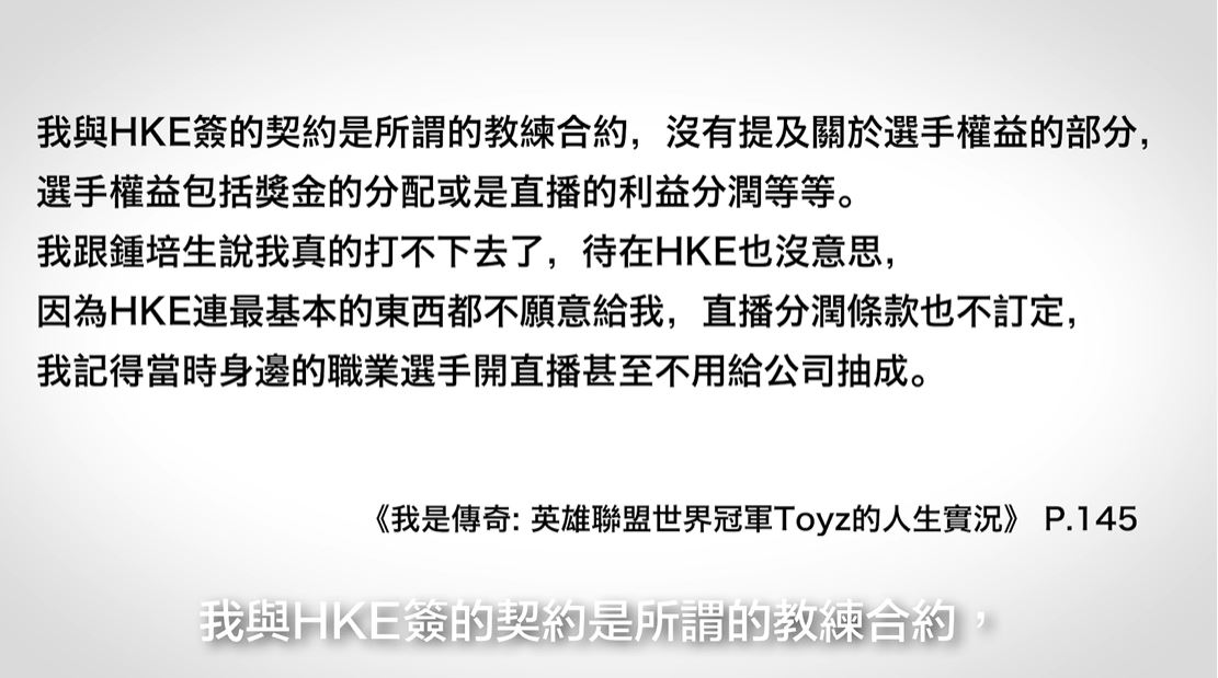 「Toyz」是來自香港的職業電競選手,曾為台北暗殺星職業隊伍贏得冠軍,之後他則轉至香港的電競公司HKE,成為「鍾培生」的員工,無奈兩人在合約後期卻出現了許多的糾紛,讓「Toyz」被公司冷凍了長達一年的時間,雙方甚至出現對簿公堂的情況,最終以210萬港幣的和解金結束了合約,兩人還為此上演了大和解的戲碼。