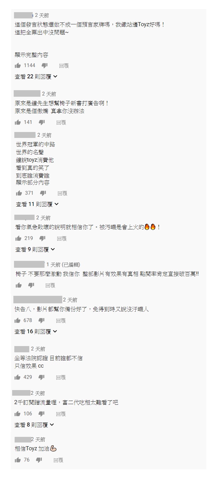 而網友們在看完兩人互相公開嗆聲喊話的影片,也紛紛挑出來力挺「Toyz」,更留言表示「我鐵站邊Toyz」「看你氣急敗壞的說明就相信你了。被污衊是會上火的」「2千訂閱蹭流量喔,富二代吃相太難看了吧」「相信Toyz 加油」。
