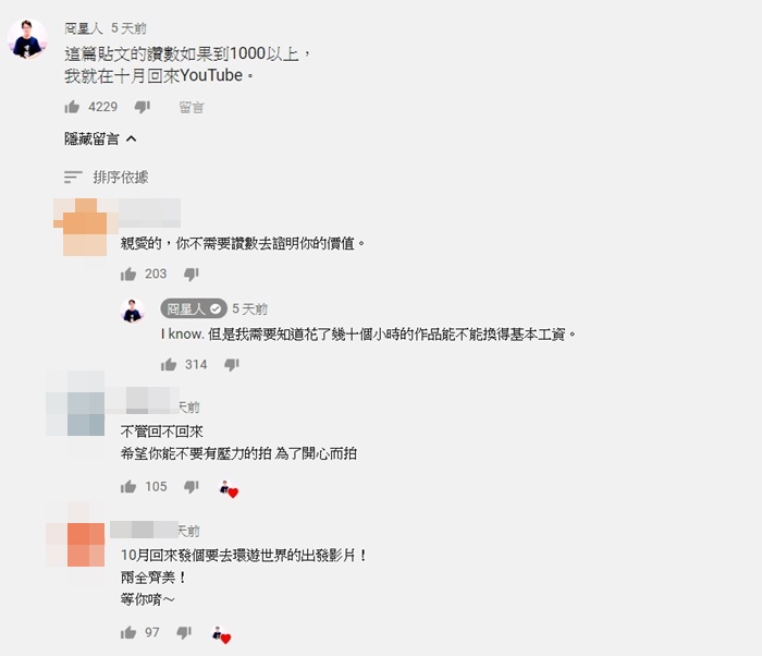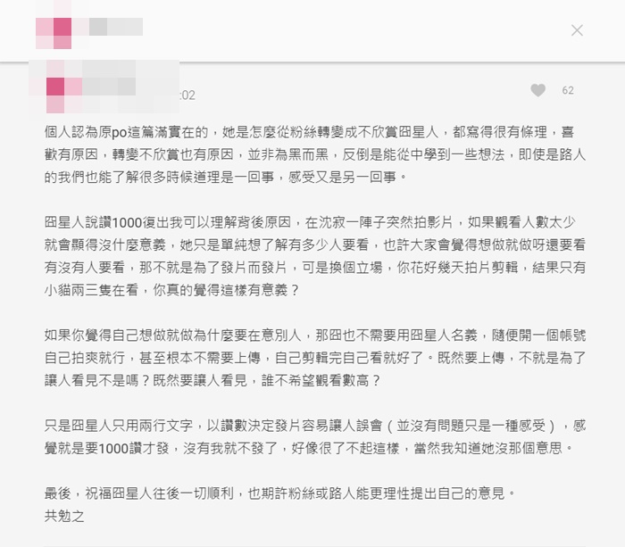 原PO的理性分析,引來不少網友認同,不過也有其他人表達不一樣的意見,「囧星人說讚1000復出我可以理解,沈寂一陣子突然拍影片,如果觀看人數太少就會顯得沒什麼意義,她只是單純想了解有多少人要看,也許大家會覺得想做就做呀還要看有沒有人要看,那不就是為了發片而發片,可是換個立場,你花好幾天拍片剪輯,結果只有小貓兩三隻在看,你真的覺得這樣有意義?」