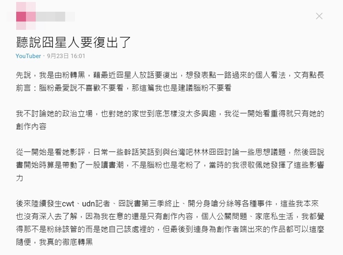 然而此時卻有網友在Dcard上發表「聽說冏星人要復出了」一文,開頭原PO先提及自己原先是粉絲,後來才轉黑,藉著這次冏星人放話復出,發表一些自己的看法。原PO表示,即便冏星人捲入多起爭議事件,但只要創作內容好,其餘公關問題、私生活,都不是粉絲該管的,可惜最後冏星人創作出來的作品卻有點隨便,因此徹底轉黑。