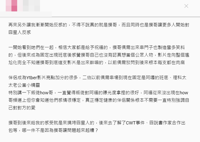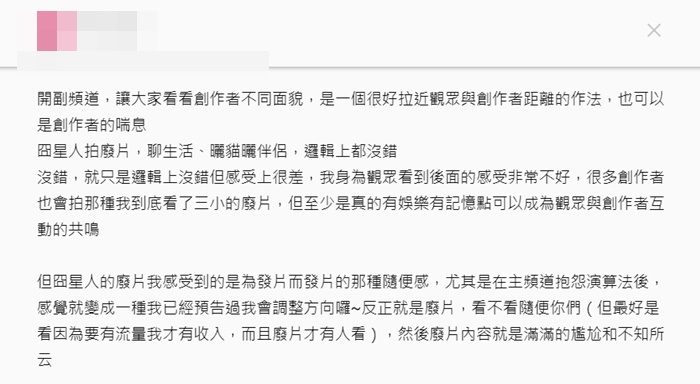 接著原PO也提及,冏星人的廢片令人感到「為發片而發片」的隨便感,內容更時常可以感受到滿滿的尷尬!原PO也表示冏星人的伴侶「摸哥」,帶來不少反效果,甚至讓人覺得是來搞垮冏星人。