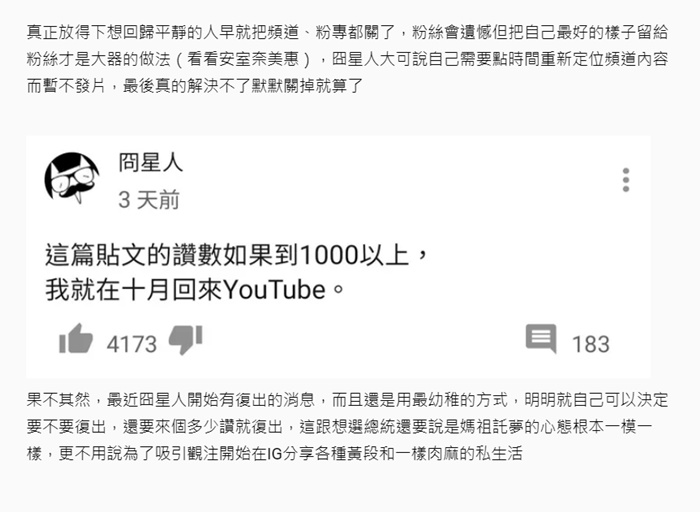 這次冏星人的復出動作,更讓原PO覺得「冏星人放不下名氣」,並非真正想回歸平靜,甚至還用一個最幼稚的方式來決定是否復出,這也讓原PO在文末留下「我是真的不會再相信」一句話。