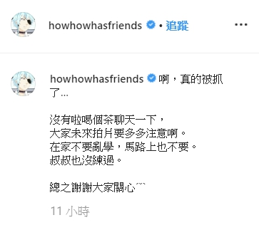 HowHow被約談後,自己也在IG上發文調侃自己,「啊,真的被抓了…」隨後也表示只是喝個茶聊天一下,並提醒大家在拍片上要多多注意,「在家不要亂學,馬路上也不要。叔叔也沒練過。」最後HowHow也謝謝粉絲們的關心,目前有爭議的影片也已下架處理。