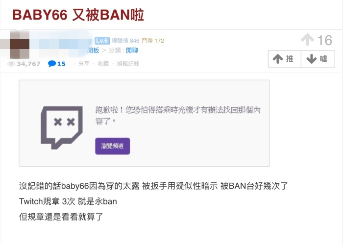 日前有網友發現,baby66竟然又被Ban!實際上搜尋66的Twitch,出來的畫面便是「抱歉啦!您恐怕得搭乘時光機才有辦法找回那個內容」,無法找到66的實況頻道。該名網友也表示,「沒記錯的話,baby66因為穿得太露,被ban台好幾次了,Twitch規章3次就是永Ban,但規章還是看看就算了」!