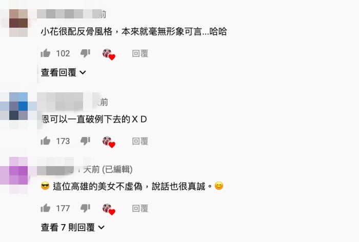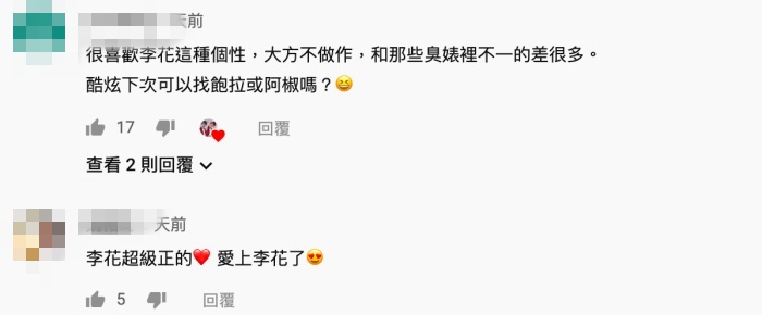 影片一出後,不少網友直接點出「走光畫面」秒數,直呼是本篇精華!另外也有許多人留言稱讚李花的個性,「李花這個性真的很讚,完美女友個性,夠真」、「小花很配反骨風格,本來就毫無形象可言」、「很喜歡李花這種個性,大方不做作,和那些臭婊裡不一的差很多」。
