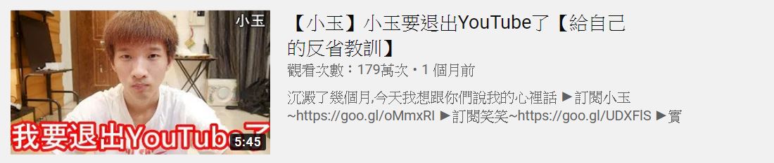 Youtuber「小玉」出道以來爭議不斷,曾經鬧出超商拍片、泡現金浴炫富、炒作等事件,負面新聞不斷,引起大眾負面觀感。儘管如此,他獨特、無厘頭的拍片風格仍吸引許多死忠粉絲,頻道有145萬粉絲訂閱。前陣子小玉曾拍片透露,自己的九月點閱數若是沒有達標,就要退出Youtube界,引起譁然。近日小玉的夥伴「笑笑」也發文透露,「還是不想放棄吧」。