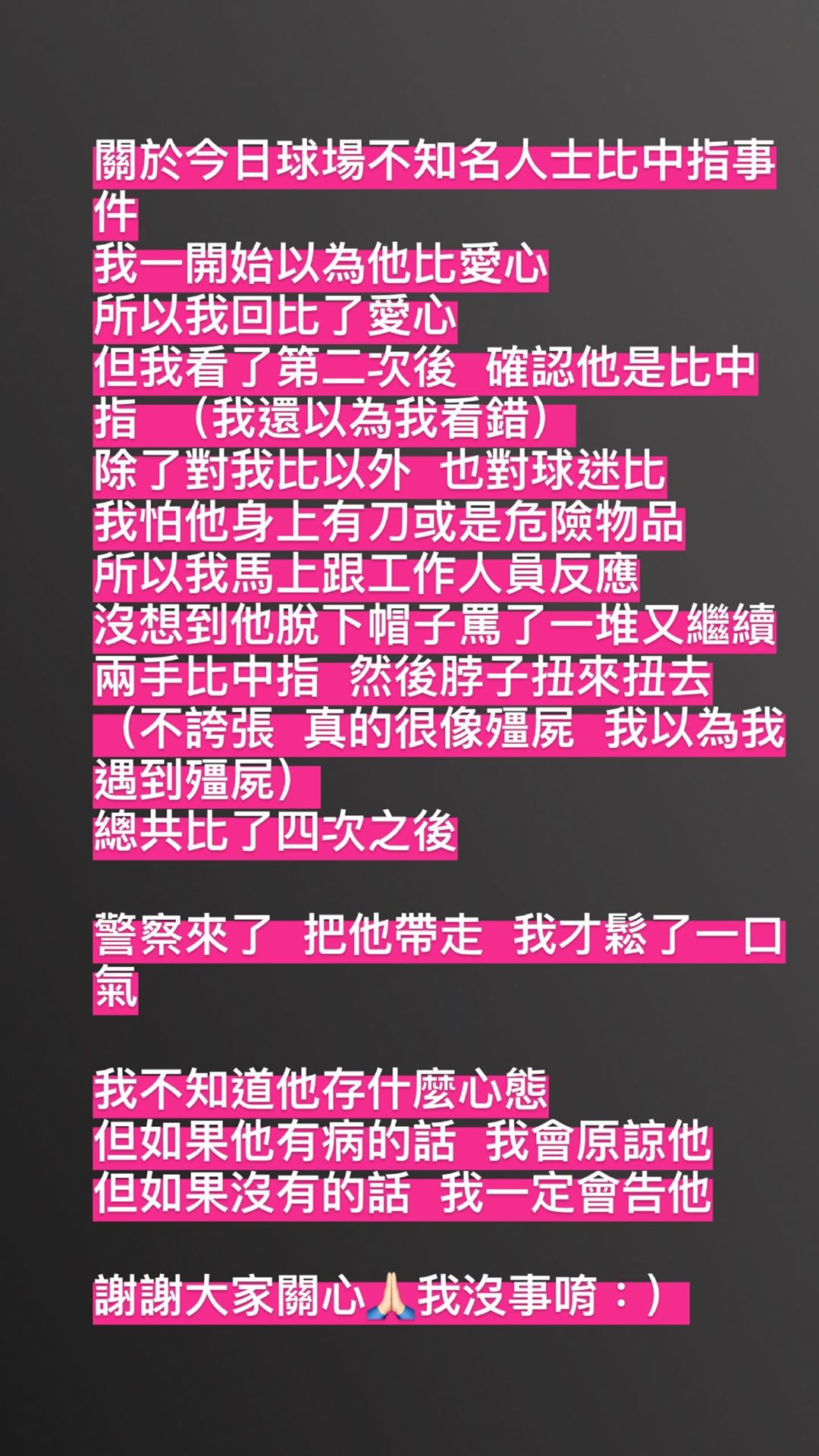 當天琳妲在限時動態回應「中指事件」,表示一開始以為對方手比愛心,所以琳妲也回比了愛心手勢,結果琳妲看了第二次後,發現對方是比出不雅手勢。而且琳妲發現,對方除了對自己不禮貌之外,也朝著場內其他的球迷們比中指,讓琳妲害怕該民眾身上會攜帶危險物品,所以立刻向場內的工作人員反應。結果此舉疑似激怒了對方,讓對方脫下帽子開始大罵髒話,脖子不斷扭來扭去,兩手也頻繁比出不雅手勢,一直到警察將該名情緒失控的民眾帶走之後,琳妲才終於鬆了口氣。