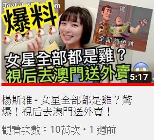 19日時,楊斯雅上傳影片「女星全部都是雞?驚爆!視后去澳門送外賣!」驚爆電視圈中確實有女藝人賣淫,更透露有視后級的女星被富豪包養,時常要飛到澳門「送外賣」。證實演藝圈內的潛規則,也揭露女明星們光鮮亮麗背後,不為人知的一面,對演藝圈拋下一顆震撼彈。