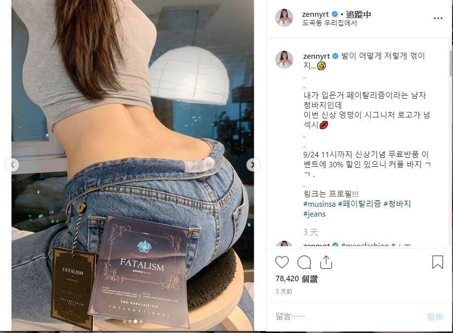 在另一張照片中,申才恩將視角聚焦於屁股上,穿著牛仔褲的她大展自己的腰線和「蜜桃臀」曲線,完美詮釋牛仔褲的時尚和性感,讓網友紛紛留言直呼「我要去買牛仔褲~」、「除了美麗之外,這腰線實在是太美了」、「這個螞蟻腰啊」。