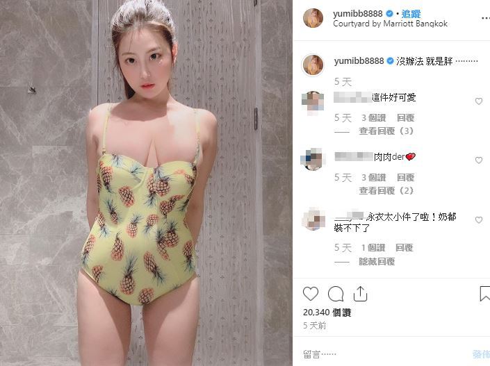 擁有好身材更十分大方的Yumi時常拿自己的身材開玩笑,上週人在曼谷度假的她,在飯店裡試穿連身泳裝卻發現尺寸太小,並難過表示「沒辦法就是胖」。照片可見Yumi的泳裝相當貼身,也因為尺寸太小胸部完全被壓扁,被半球甚至被擠到罩杯外而變形,引起網友笑稱「肉肉才可愛」、「泳衣太小,奶都裝不下了」、「明顯買太小件吧」。